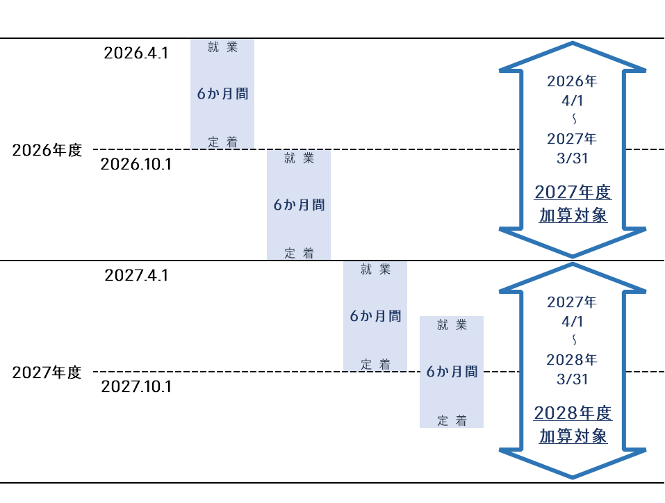 2027(令和8)年度を例に考えてみましょう。2027年度に就労移行支援体制加算を算定できるのは、2026(令和7)年度中に6か月に達した就労定着者がいる事業所です。
