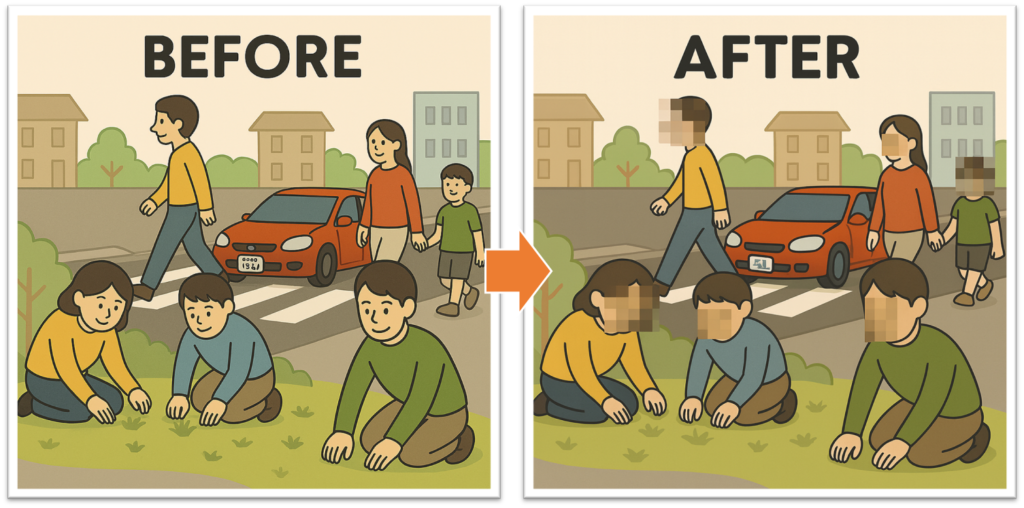 作業報告フォームへ写真をアップロードする前に、必ず加工(モザイク・ぼかし)をおこなってください。