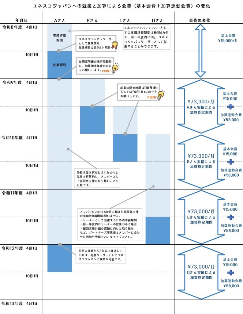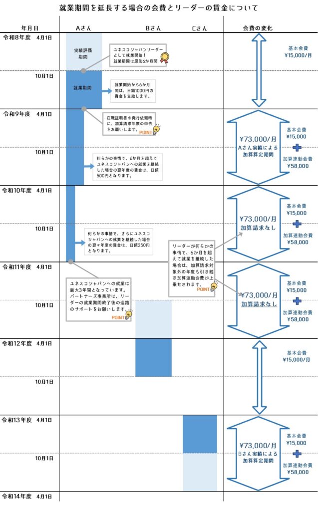 通常、加算連動会費は、就労移行支援体制加算を算定している期間中のみお支払いいただくものですが、原則6か月間の就労期間を超えて、ユネスコジャパンへの就労の延長される場合には、加算算定対象外の年度であっても、基本会費に加えて加算連動会費のお支払いが必要となります。
