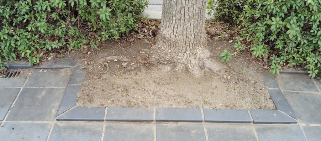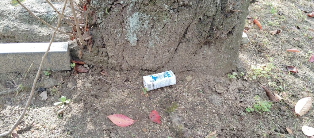 街路樹の近くに飲料のパックがポイ捨てされていた。