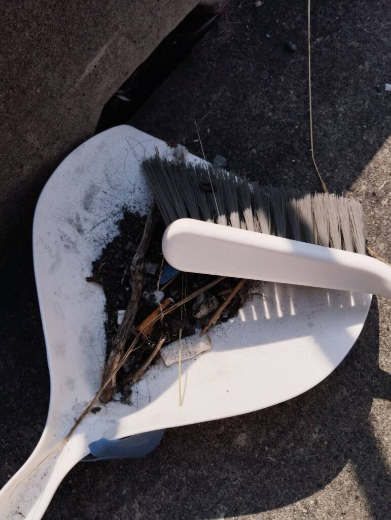 タバコの吸い殻の掃除にほうきとちりとりがとても役に立った。周りにボランティアの方がいてもう少し大きいものを使っておられて便利そうだなと思った。