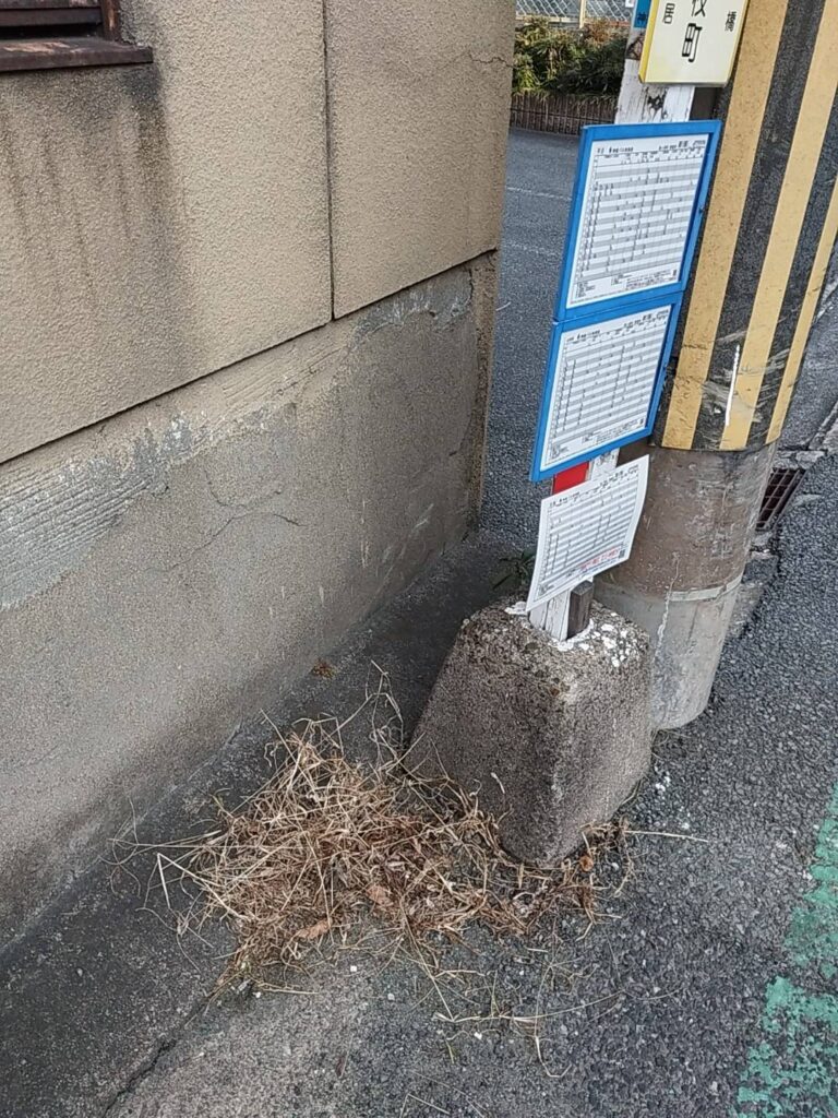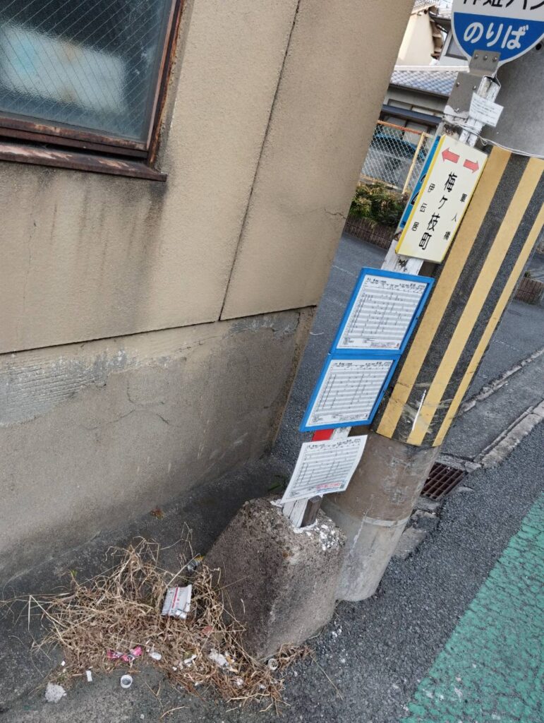 バス停の掃除。バスを待ってる時にポイ捨てされたと思われるゴミがたくさん落ちていた。