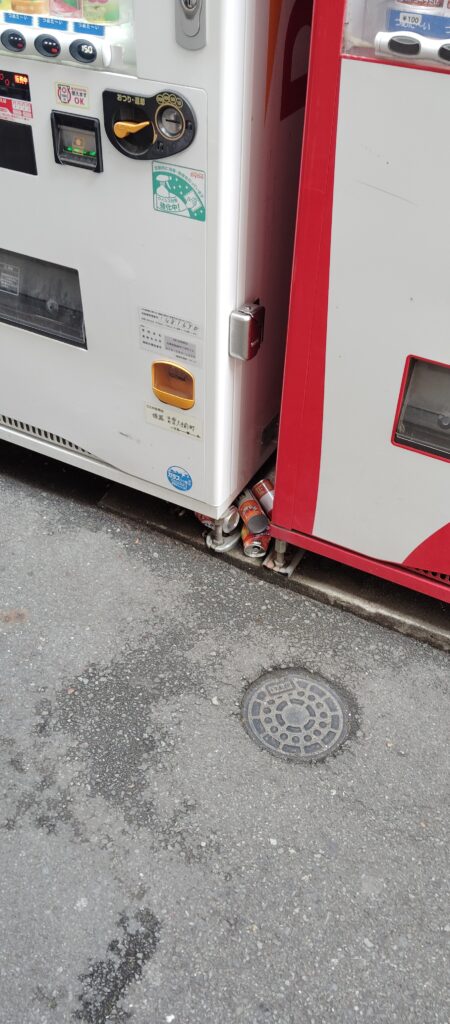 大通りを少し外れた場所にある自動販売機の足元に、空き缶が捨てられていました。ゴミ箱に捨てるか持ち帰ればいいのにと少し残念な気持ちになりました。