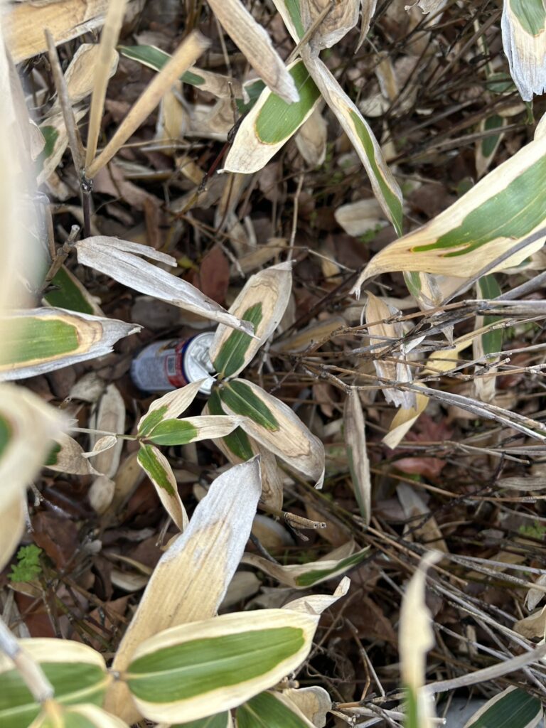 一見するとゴミなどは落ちていないようにみえますが、植え込みの中をかき分けると、空き缶などのゴミが見つかります。