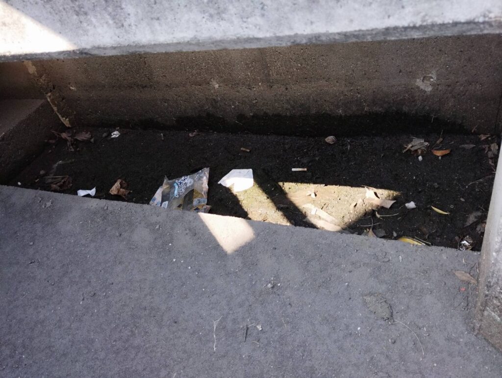 植木鉢にたばこのゴミや吸い殻が捨てられていた。