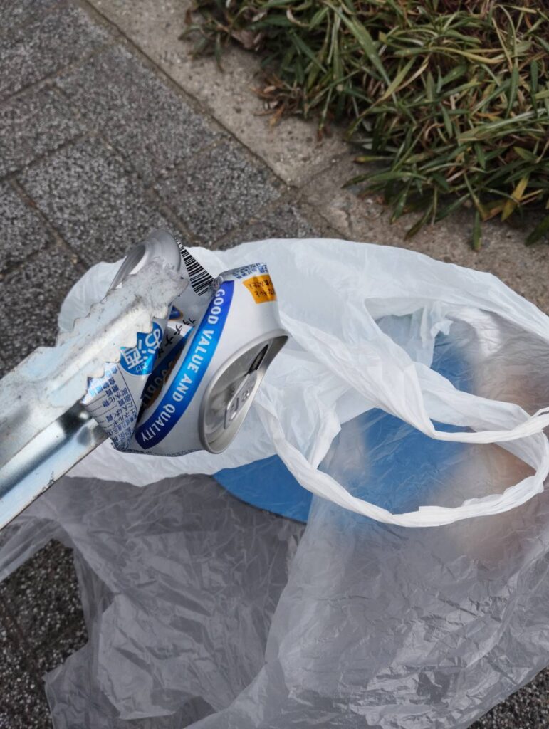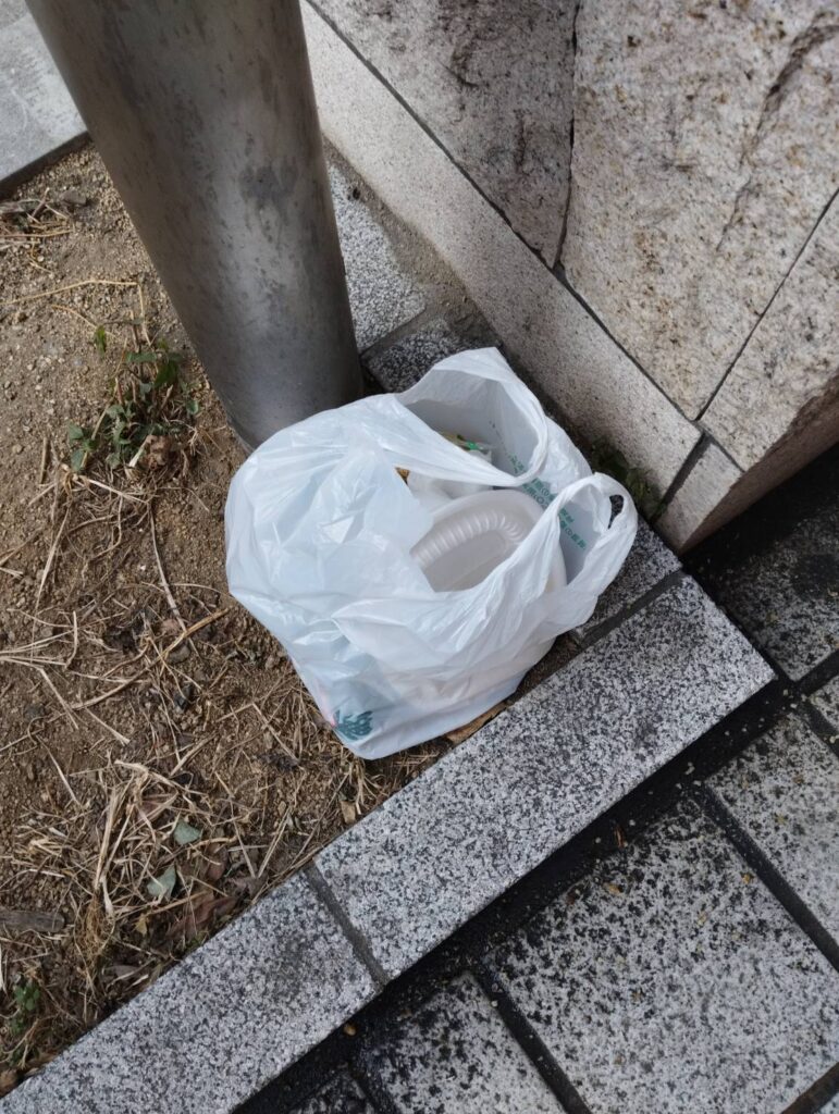 おでんの器(汁が入った状態)と缶チューハイの空き缶がまとめて捨ててあった。