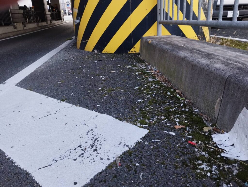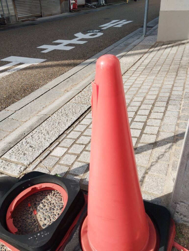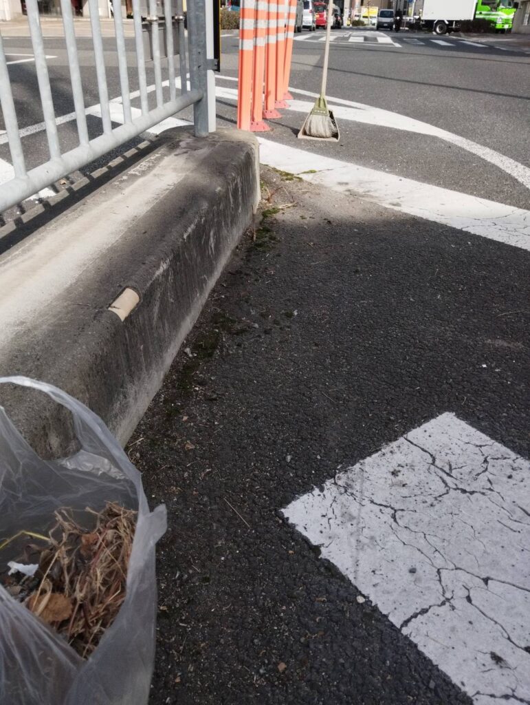 飛んで行ってしまったのか、道に転がっている割れたコーンがあり危険だったので、事業所のスタッフと相談して、おそらく仲間だろうと近くあるコーンに重ねておくことになった。「誰かがケガしなくてよかったです。」と作業報告を受ける。