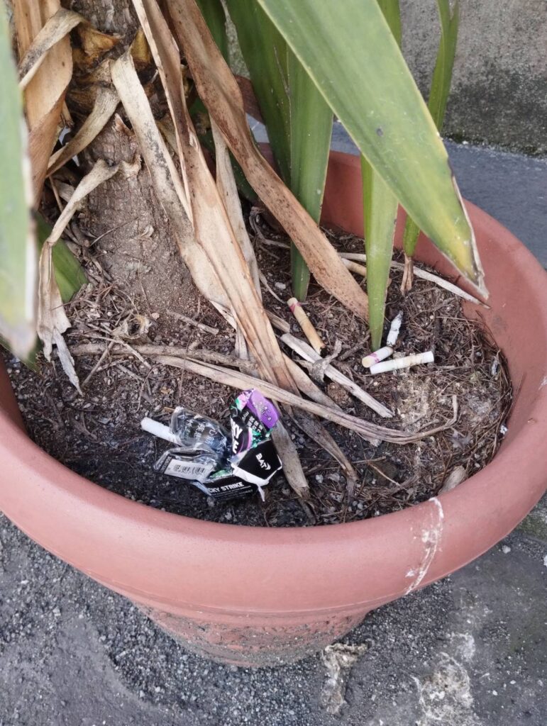 植木鉢にたばこのゴミや吸い殻が捨てられていた。